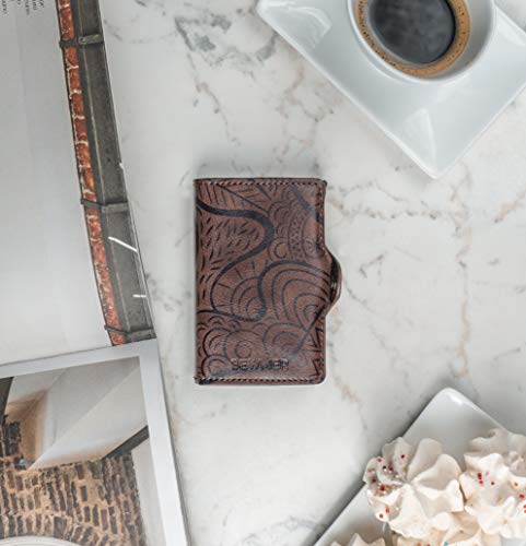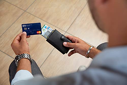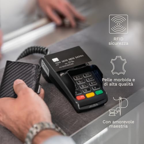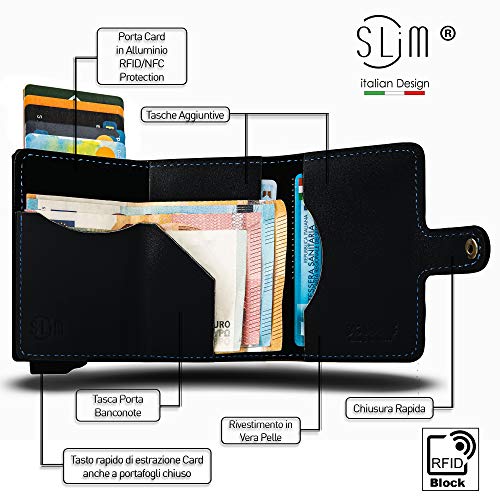 - [SICUREZZA] La protezione RFID / NFC mantiene al sicuro le tue carte contactless da clonazioni e altre truffe garantendoti un portafoglio schermato e anticlonazione. Inoltre la leva del sistema automatico di estrazione delle carte non permette la fuoriuscita accidentale delle carte di credito dal portafoglio