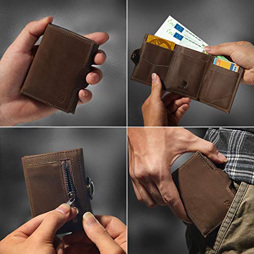 - ✅ CAPIENTE E FUNZIONALE - il mini wallet si apre a libro ed è dotato di una resistente linguetta porta banconote in Vera Pelle, 2 tasche interne porta tessere e di una cassa in alluminio contenente fino a 6/7 carte, munita di meccanismo anticaduta trattiene le carte anche capovolgendo il portafoglio. La clip favorisce un'estrazione rapida e sicura delle schede, un sistema d'utilizzo intuitivo adatto anche ai mancini.